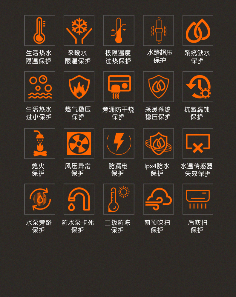 燃?xì)鉄崴饕话憔邆涞谋Wo(hù)功能有:防意外熄火、防沸騰、燃?xì)庑孤侗Wo(hù)等十余項(xiàng),壁掛爐安全保護(hù)功能則更多,如菲思盾壁掛爐還涵蓋風(fēng)壓保護(hù)、供暖系統(tǒng)過(guò)壓保護(hù)、安全泄壓、自動(dòng)排氣、煙道堵塞保護(hù)等多重防護(hù)措施,遵從“安全采暖”宗旨,讓用戶能夠放心使用。