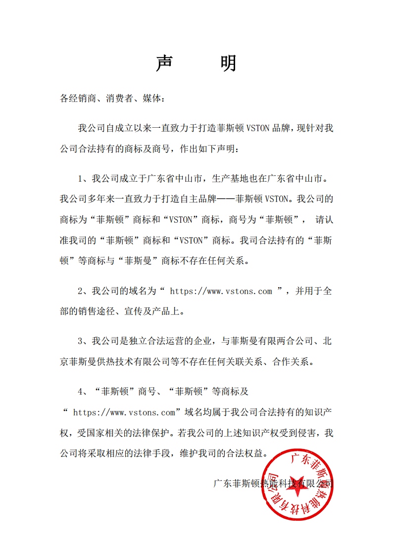 1、我公司成立于廣東省中山市,生產基地也在廣東省中山市。我公司多年來一直致力于打造自主品牌——菲思盾VSTON。我公司的商標為“菲思盾”商標和“VSTON”商標,商號為“菲思盾”, 請認準我司的“菲思盾”商標和“VSTON”商標。我司合法持有的“菲思盾”等商標與“菲斯曼”商標不存在任何關系。