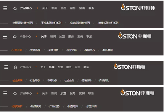 導航欄部分主要分為產品中心,關于企業,新聞,加盟,服務,案例,聯系等七大板塊。每個版塊又對版塊進行細分,分類清晰,檢索明確。
