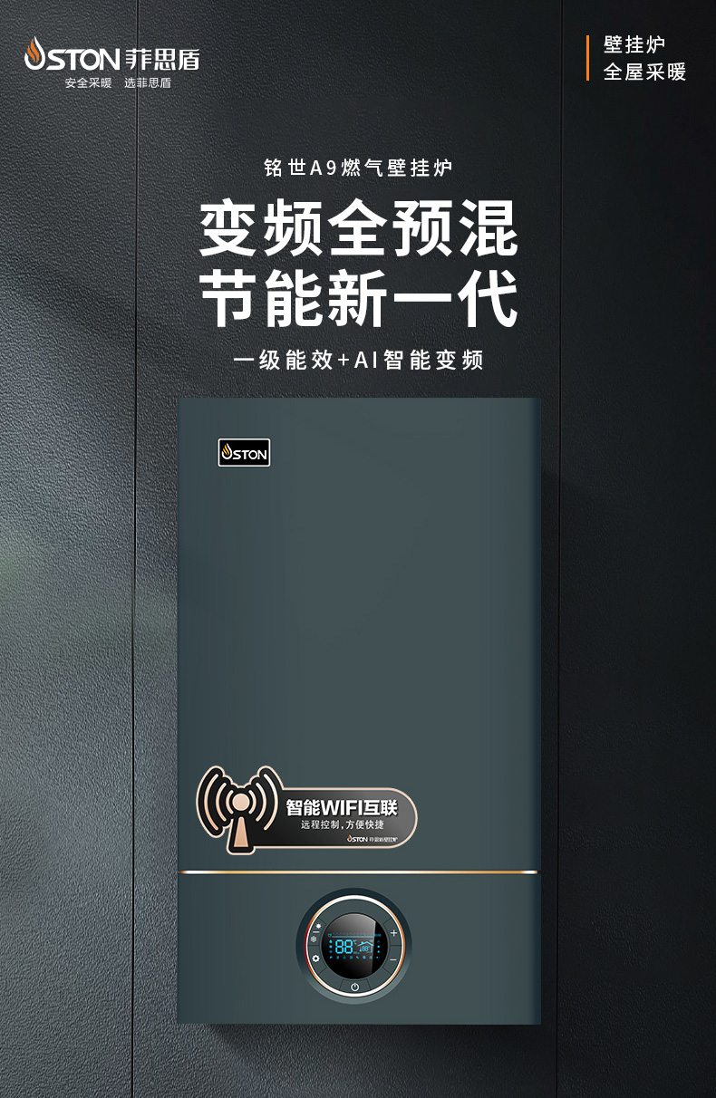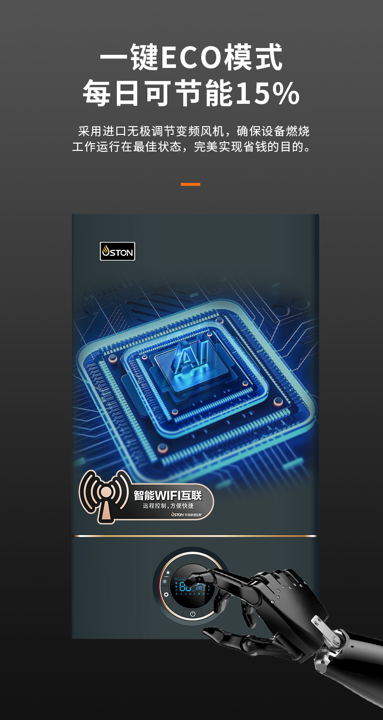 AI智能芯片集成變頻控制燃氣預混系統、燃燒系統、冷凝系統、燃氣配比,使燃燒更充分。